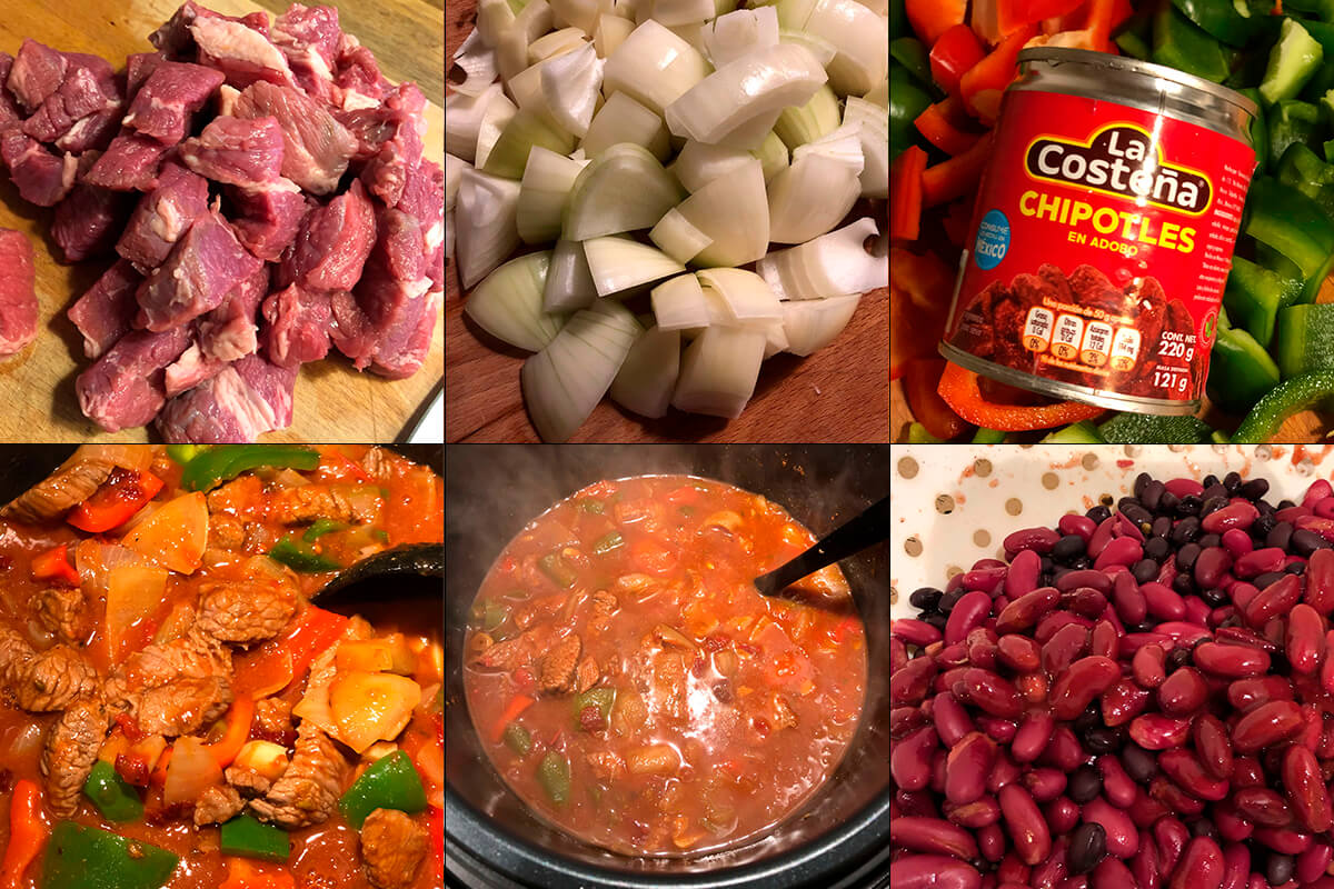 • Følg fremgangsmåden herover indtil step nr. 6. I stedet for at koge retten i 2-3 timer, kan den hældes i trykkogeren og koges under tryk i 50 minutter. Herefter tilføjes bønner og chokolade, og retten koges 10-15 minutter (ikke under tryk) og smages til med salt, peber og brun farin.