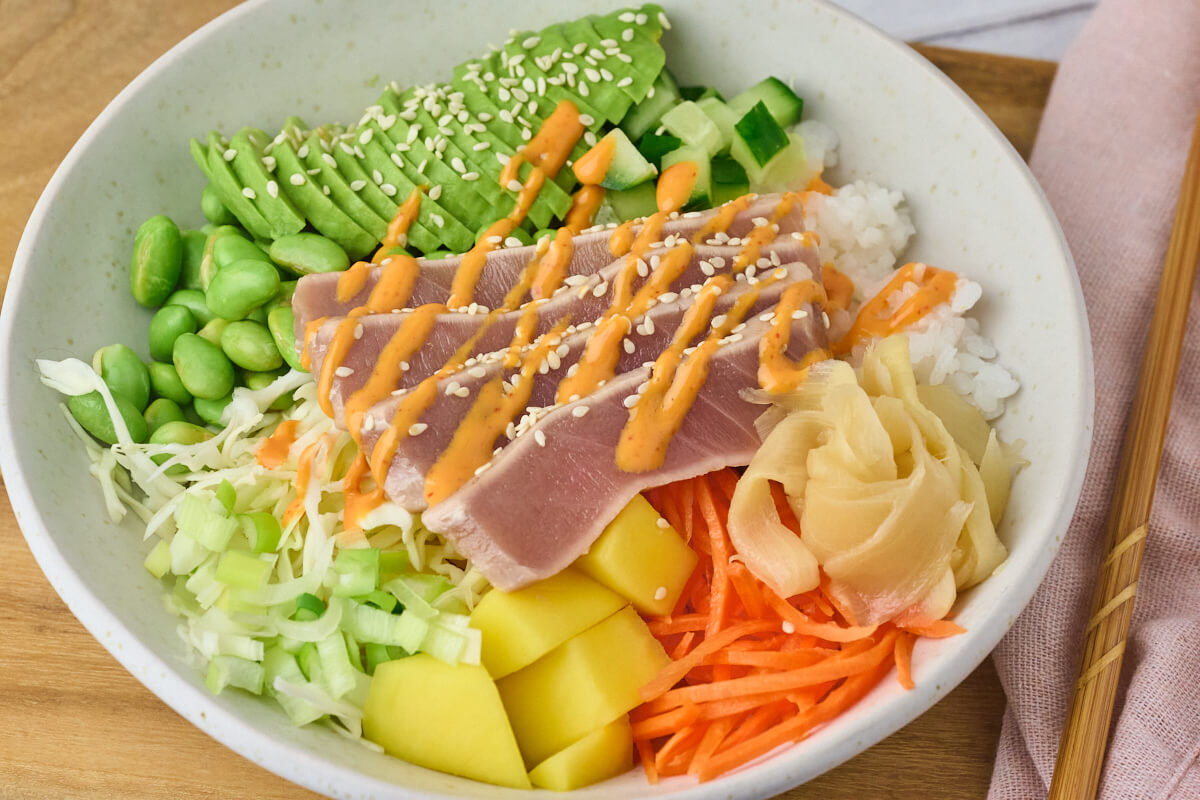 - Anret i en skål med sushiris nederst og så de forskellige grøntsager og syltet ingefær. Skær tunen i tynde skiver og læg den på toppen. Top med chilimayo, sesamfrø og server straks.2 spsk chilimayo, 2 spsk syltet ingefær, 1 spsk sesamfrø